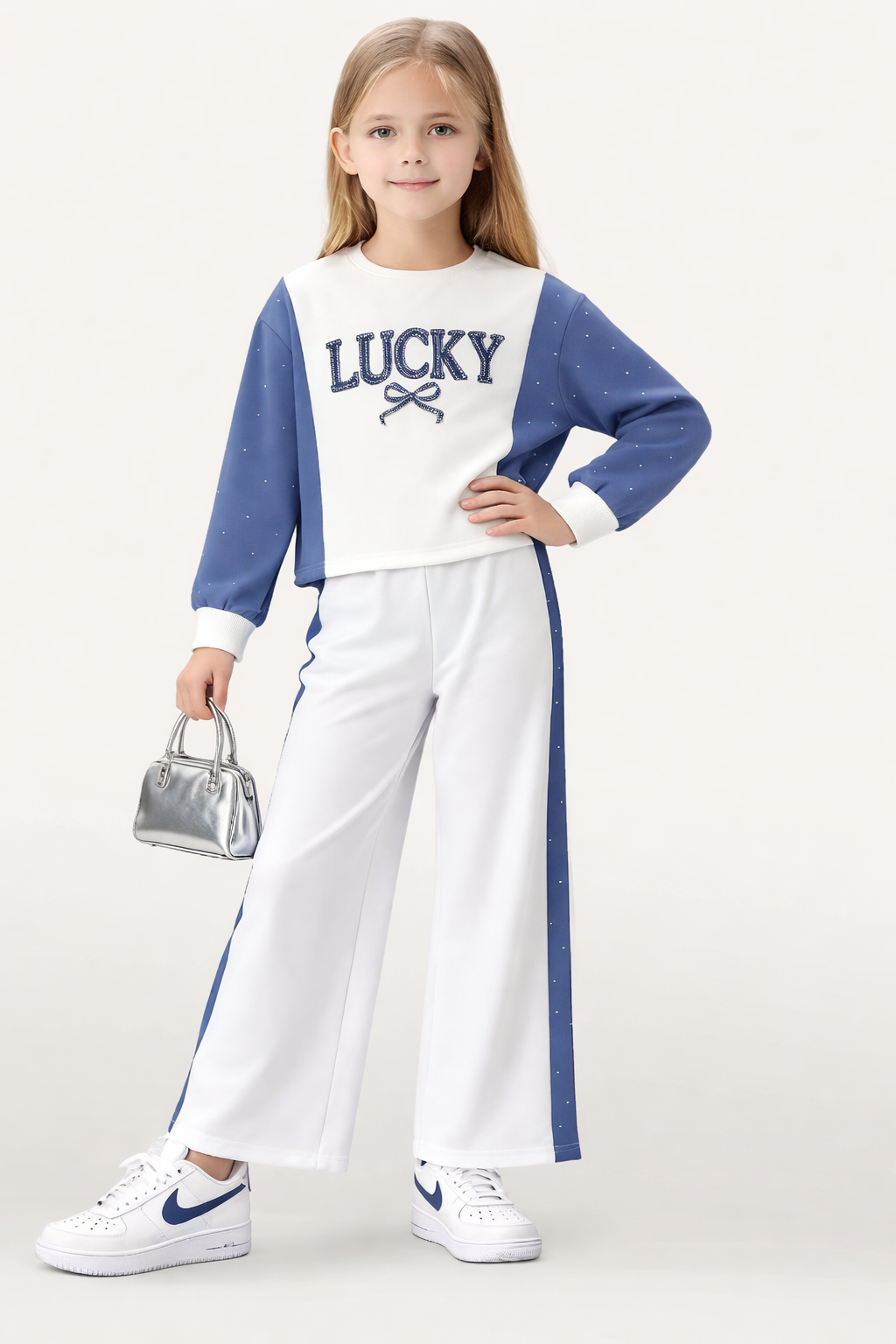 Felpa bianca con maniche blu impreziosite da piccoli strass luminosi e scritta “Lucky” con fiocchetto decorativo sul davanti.