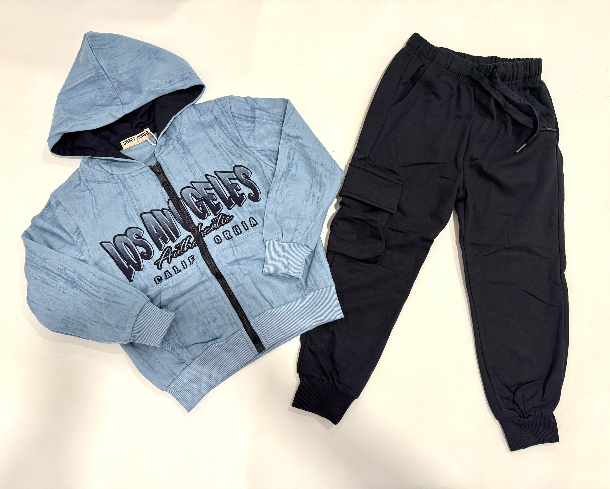 Comodissimo completo tuta da bambino composto da felpa con cappuccio in azzurro chiaro con stampa Los Angeles e pantalone jogger cargo nero.