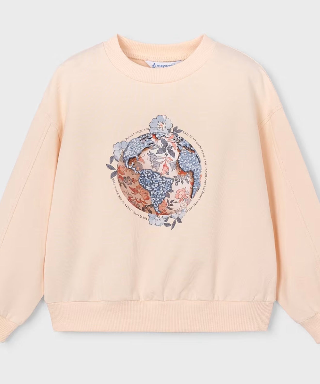 Questa felpa bambina nel delicato rosa cipria è impreziosita da una raffinata stampa centrale a forma di mappamondo decorato con fiori, simbolo di bellezza e armonia. Perfetta per creare look comodi ma curati.