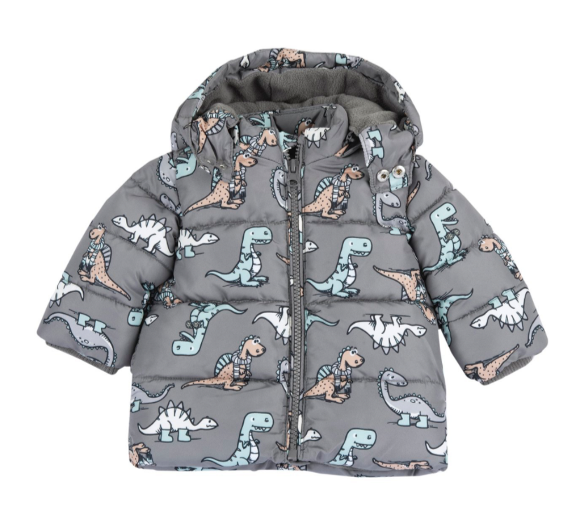 Piumino bambino con stampa all over dinosauri. Trattamento idrorepellente.