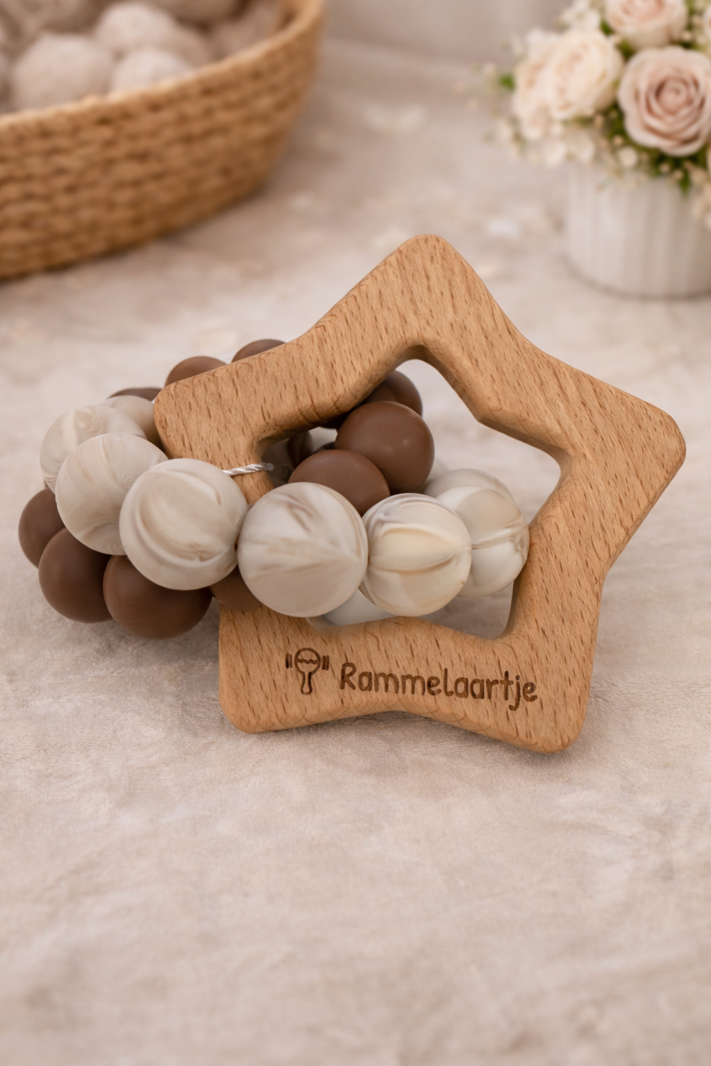 Dolcissimo massaggiagengive in legno naturale con perline in silicone nei toni neutri del beige e marrone. Perfetto per alleviare il fastidio della dentizione, stimolare la presa e accompagnare i primi momenti di scoperta.