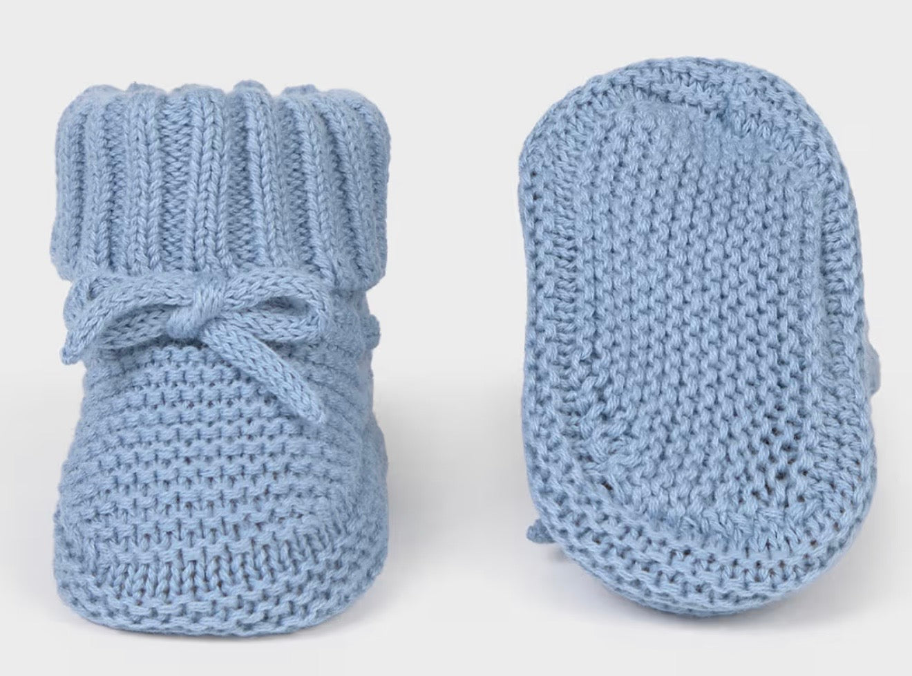 Morbide scarpine neonato color azzurro polvere in maglia lavorata con laccetto regolabile. Calde, delicate e perfette per i primi mesi.